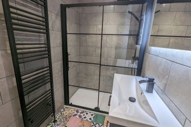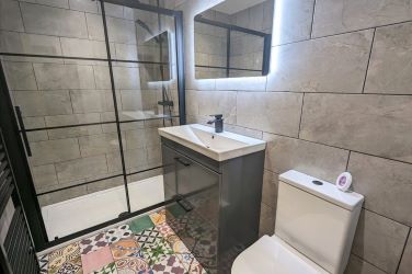 This beautifully presented home is set over two levels. The ground floor features an entrance vestibule with Artisan tiles, a bright bedroom (which could serve as a second living space), a modern shower room, and an open-plan kitchen/living area with stylish fittings, marble-effect worktops, and integrated appliances. Upstairs, there are two further bedrooms, including a spacious master with built-in storage, and a second shower room.